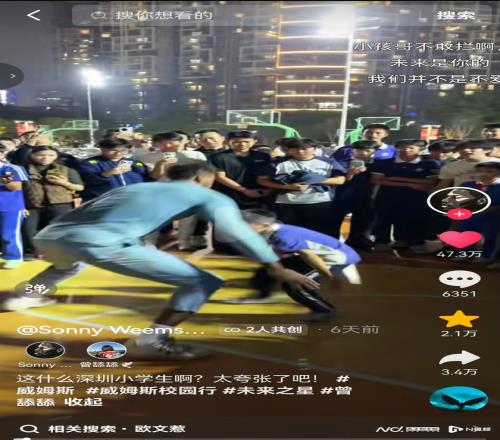 “中国欧文”“闻到了未来之星的味道”……近日,一段深圳初中生和CBA球星威姆斯超燃过招的视频火爆社交平台,点赞狂飙近50万。身高一米五的小孩哥面对近两米的职业选手,几番“声东击西”晃翻威姆斯,连续突破防守,接连灌球,让现场惊呼不断、沸腾不止!