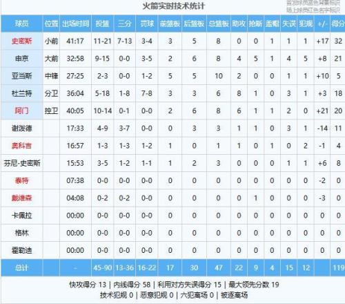 史密斯32分8板、申京21分8板4助5断、阿门20分8板6助、杜兰特18分6板8助、谢泼德11分3板1助、芬尼-史密斯8分3板、亚当斯5分10板2助、奥科吉4分1板1助