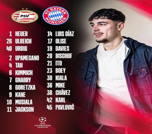 中场:6-基米希、8-格雷茨卡、10-穆西亚拉、20-比朔夫、38-查韦斯、42-卡尔、45-帕夫洛维奇